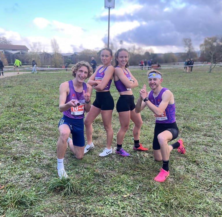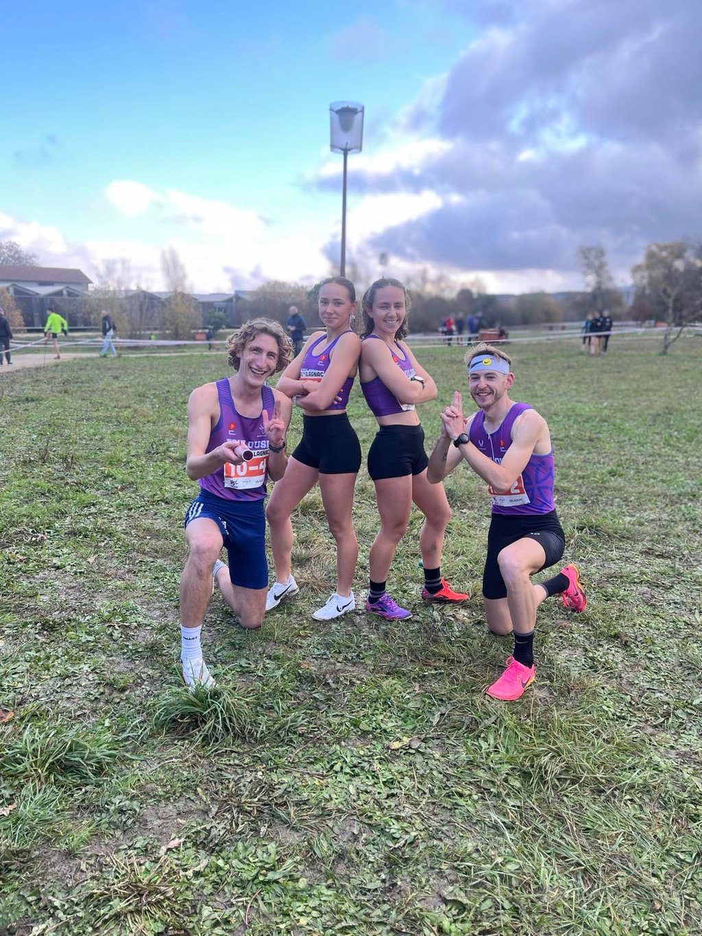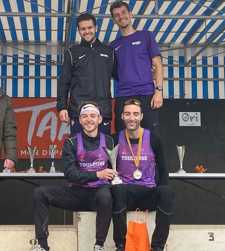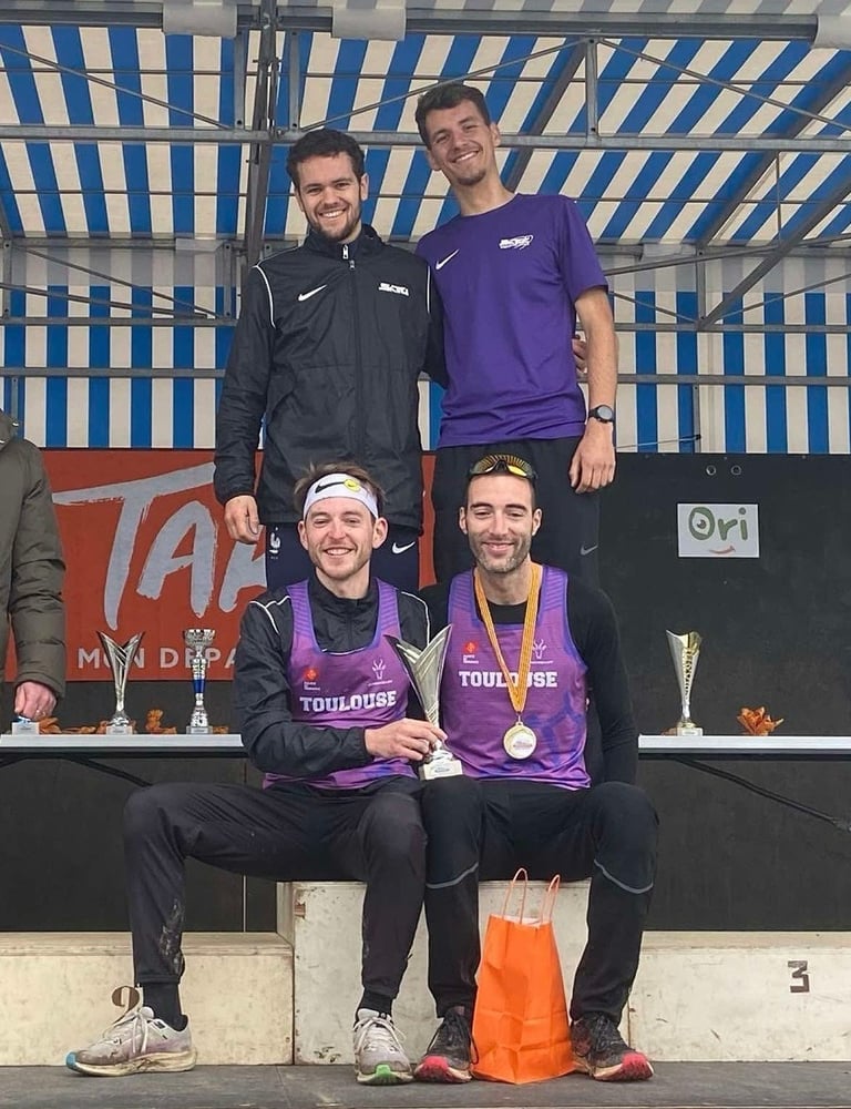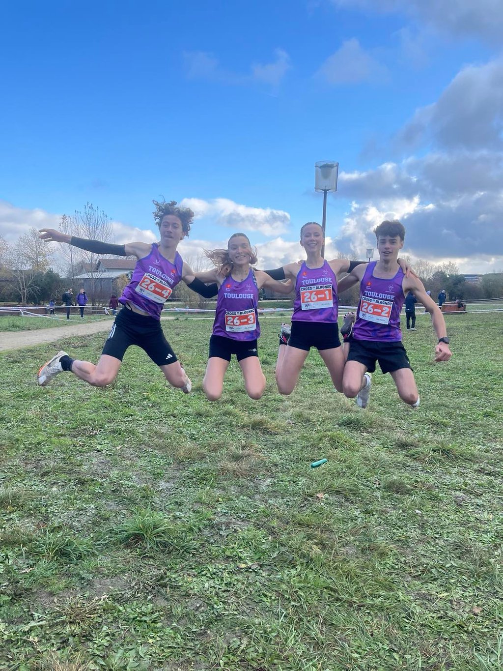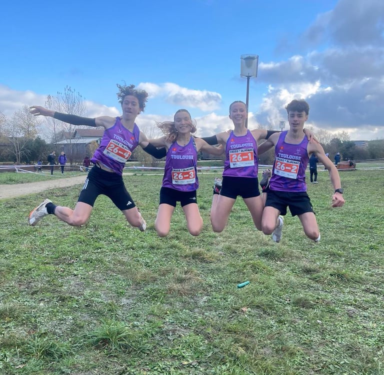 Photos : Maylis Dauby, Nathan Desbarats, Alice Mugnier, Raphaël Hardouin (juniors) et Loriana Popovičová, ainsi que Paul Abadie, Louison Mosselmans et Cyann Galtier-Villa (seniors) ont qualifié nos deux équipes de relais mixte à l'occasion du cross de Blagnac en décembre.