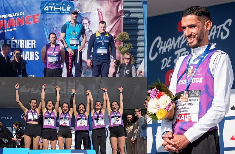 Beau week-end pour les athlètes du SATUC Toulouse Athlé présents sur les championnats de France de lancers à Salon-de-Provence et de cross-country à Challans ! De beaux moments d'athlé partagés et 3 médailles de bronze remportées : Djilali Bedrani sur cross court au terme d'une belle remontada, l'équipe féminine de cross court (Saadia Fadili, Estelle Garcia, Anaïs Sulpice, Emma Gratier et leurs coéquipières), et Julien Berges aux Nationaux de disque. Mention spéciale aux juniors Alice Mugnier 8ᵉ en cross et Camille Jalu 9ᵉ au javelot, ainsi qu'à Mathilde Desbarats 18ᵉ du cross minimes et Simon Prady 26ᵉ du cross long, et félicitations à tous les Violets qui ont mouillé le maillot sur ces championnats ! Plus d'infos à venir.