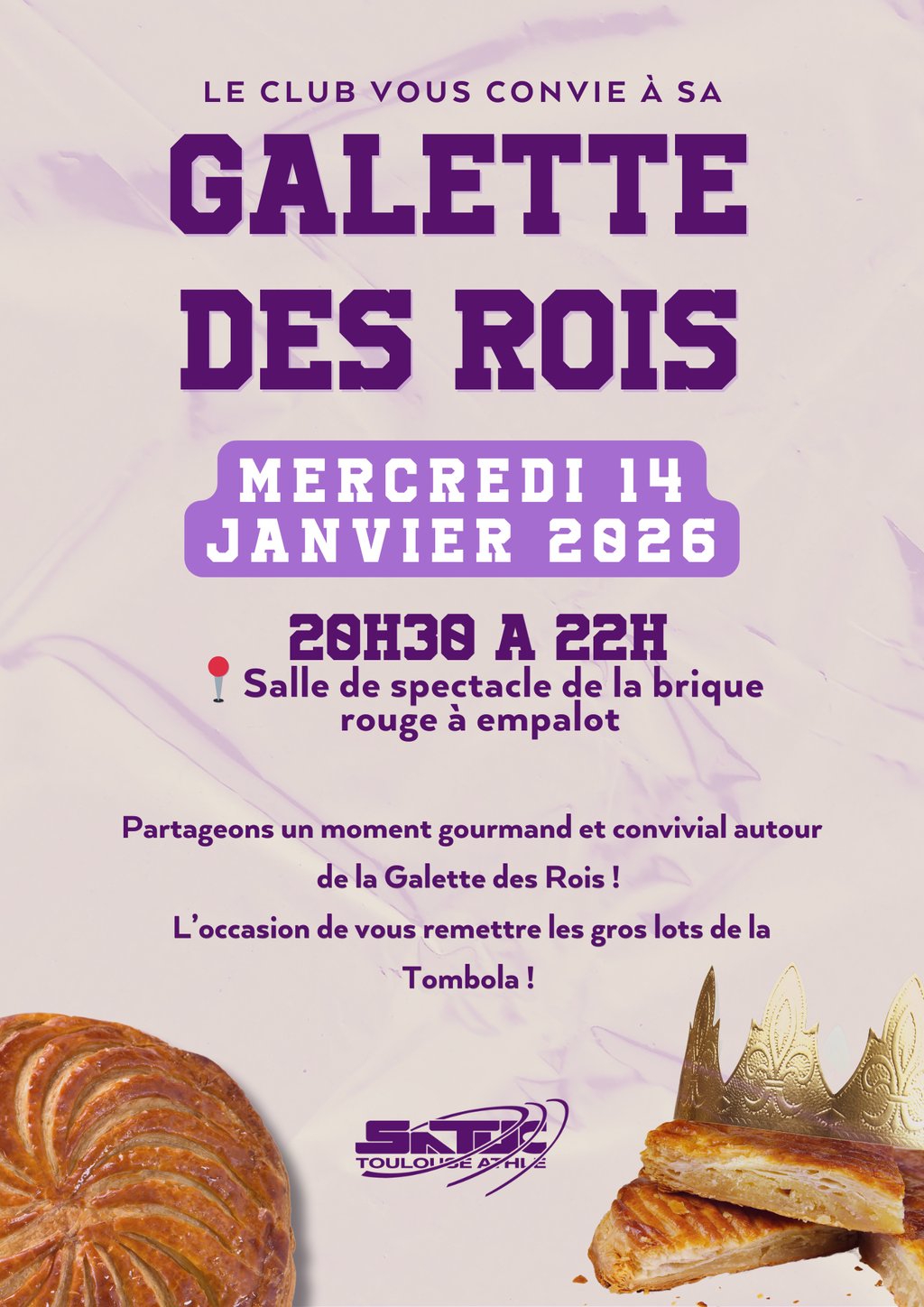 Le SATUC Toulouse Athlé vous convie à sa galette des rois le mercredi 14 janvier à partir de 20h30 à la salle La Brique Rouge (Empalot) ! Un moment gourmand et convivial, qui sera également l'occasion de vous remettre les gros lots de notre toute première tombola. Venez nombreux !