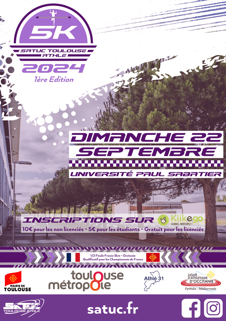 Nos coureurs sur route auront bientôt l'occasion de se tester sur la distance officielle de 5km. Nous avons le plaisir de vous annoncer la tenue de la première édition du 5km du SATUC Toulouse Athlé le 22 septembre prochain ! Tracé sur le campus de l'université Paul Sabatier, ce 5km roulant et labellisé FFA sera le support des championnats d'Occitanie et qualificatif pour les France. La course est ouverte à tous : licenciés FFA de la ligue et hors-ligue, mais aussi non-licenciés, avec un tarif préférentiel pour les étudiants. Retrouvez toutes les informations sur notre page dédiée.