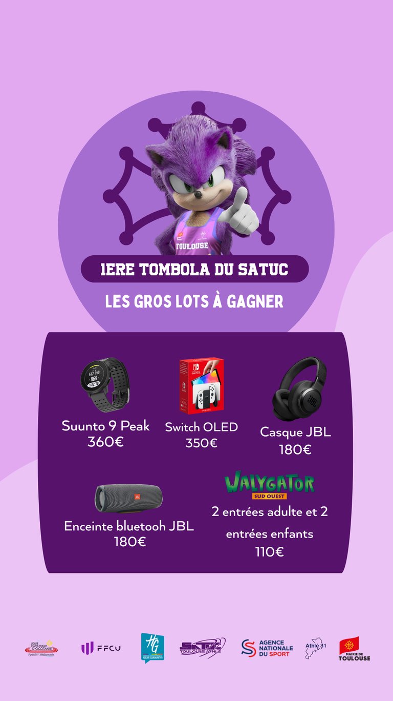 Le SATUC est heureux de lancer sa toute première tombola au profit de tous ses licenciés, toutes disciplines et catégories confondues ! Cette initiative vise à financer davantage de stages, d’activités et de moments de partage pour l’ensemble de nos sportifs. En participant, vous soutenez directement la vie du club tout en tentant votre chance de gagner plus de 2 000 € de lots ! À gagner :🏆 Une montre Suunto 9 Peak (valeur 360 €) 🎮 Une Nintendo Switch OLED (valeur 350 €) 🎧 Un casque JBL Bluetooth (valeur 180 €) 🔊 Une enceinte JBL Bluetooth (valeur 180 €) 🎁 Et plein d’autres surprises à découvrir ! 🎟️ Prix du ticket : 2€