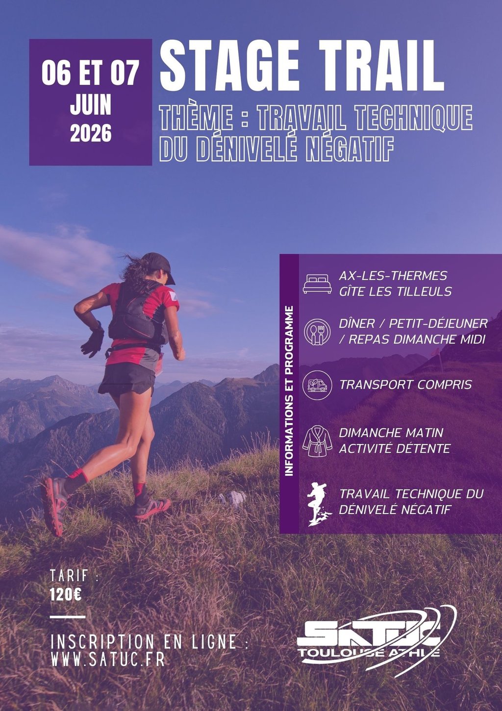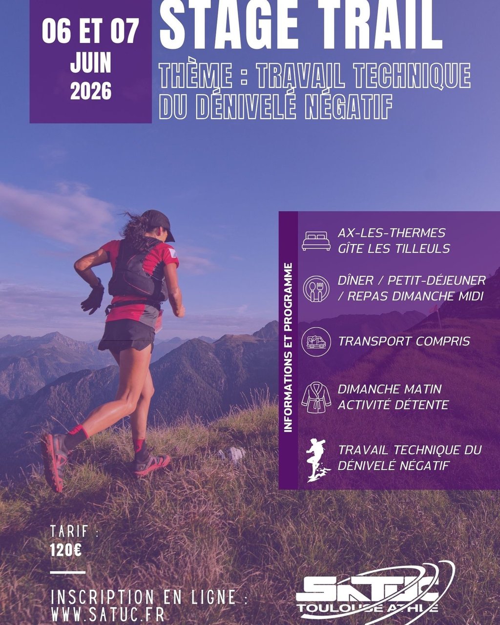 Le SATUC vous propose un week-end montagne, convivialité et détente à Ax-les-Thermes, au gîte Les Tilleuls. Au programme : sorties en nature avec travail de la technique en descente et du dénivelé négatif, idéal pour progresser en trail. Un week-end parfait pour s’entraîner en montagne, travailler la descente et récupérer dans une ambiance conviviale !